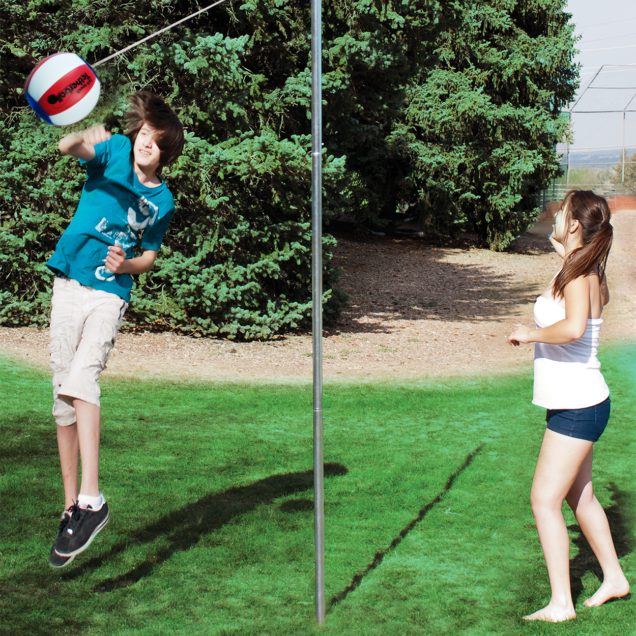Also included is a regulation sized, machine-stitched Soft Touch tetherball that features a nylon-wound bladder, an inset valve stem and an internal steel swivel hook attachment which secures the ball to the cord. The soft and durable synthetic material of the padded tetherball cover lessens the impact to hands, wrists, and arms when hit.