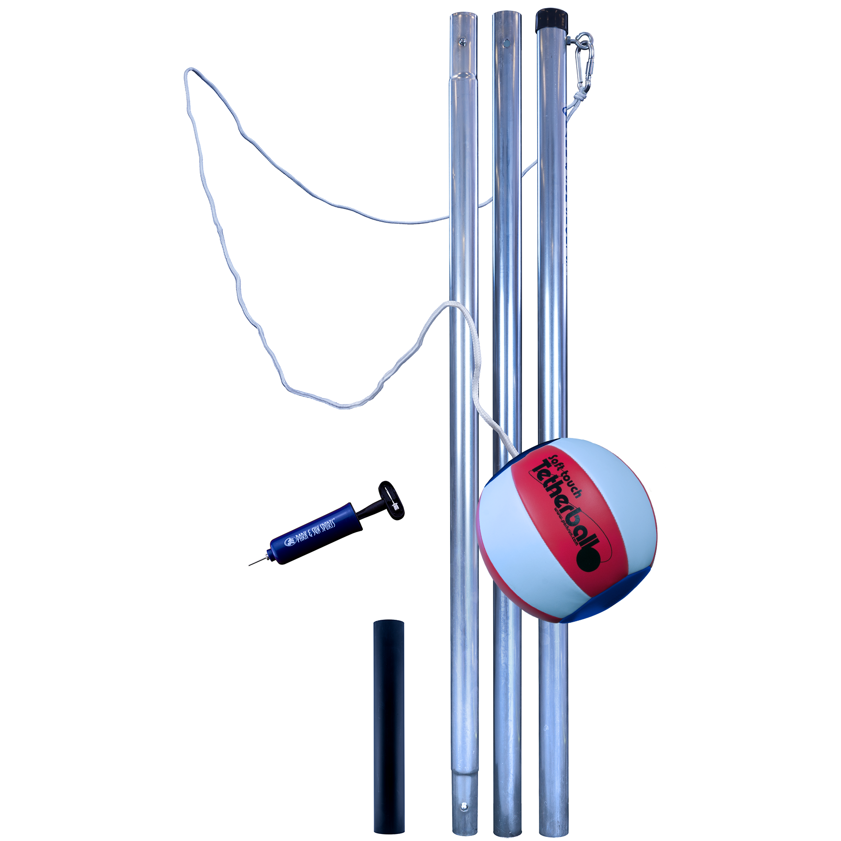This heavy-duty tetherball, Soft-Touch tetherball with cord, 1 5/8’’ galvanized steel poles are highly durable and rust-resistant. Includes a ball pump and carabiner clip for secure tether attachment.