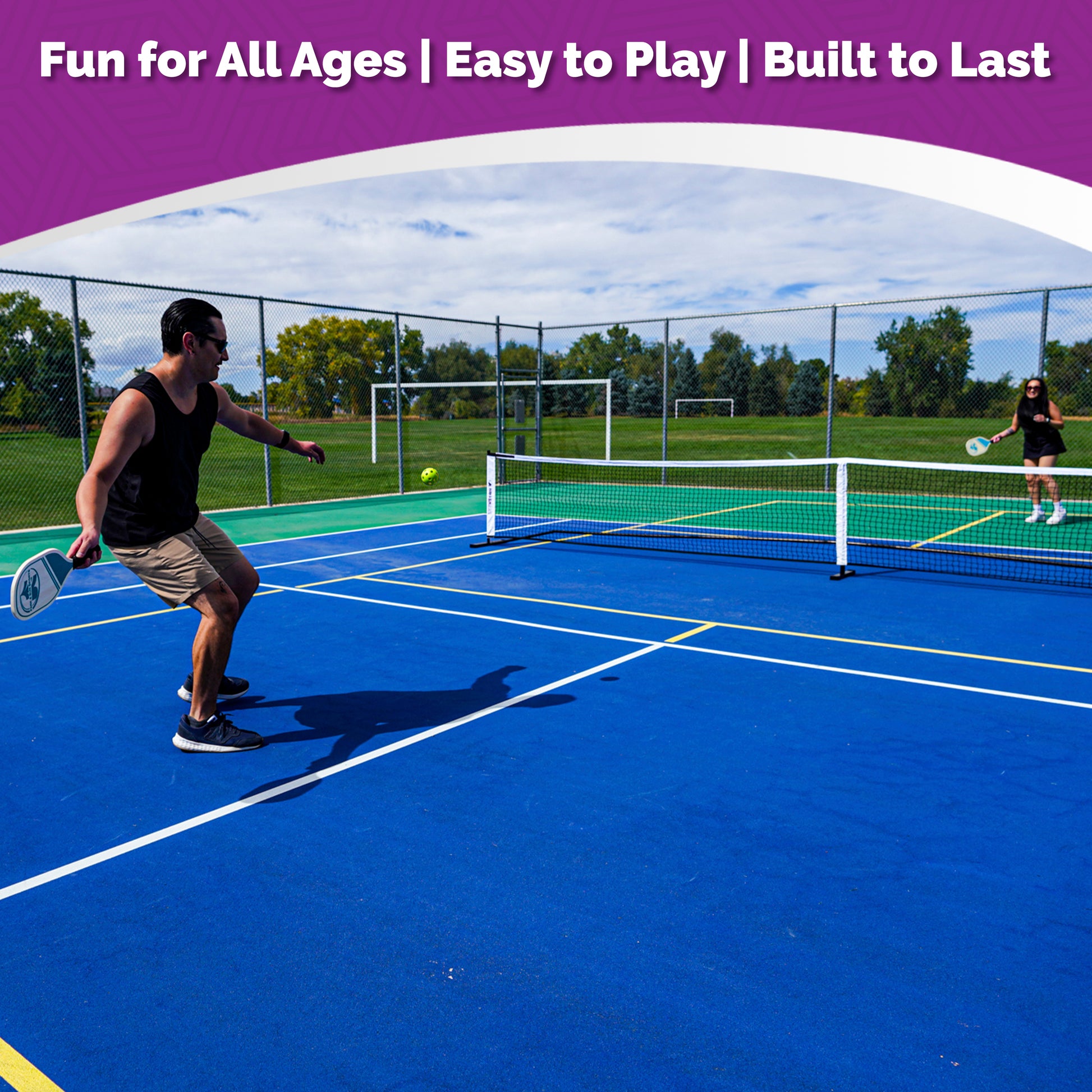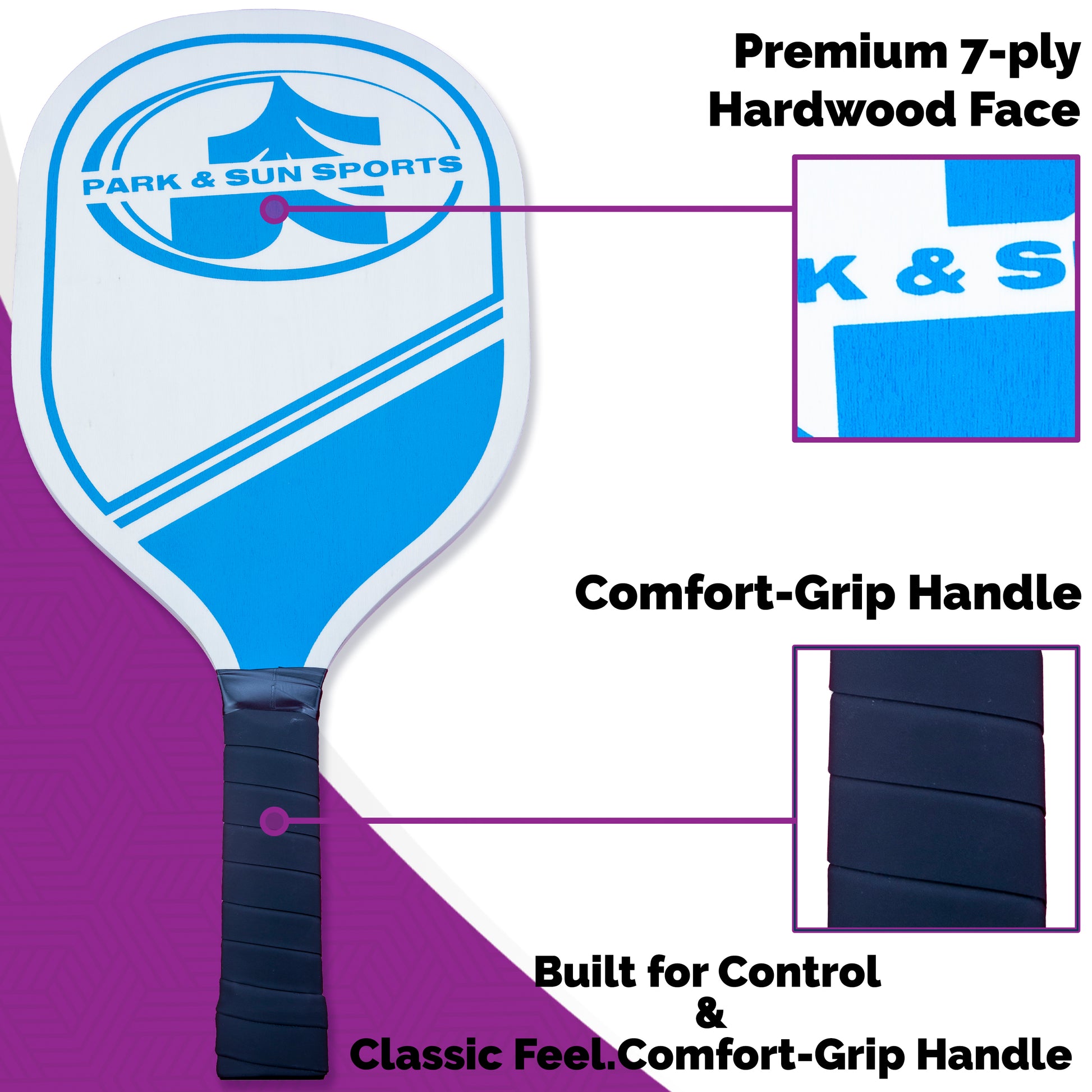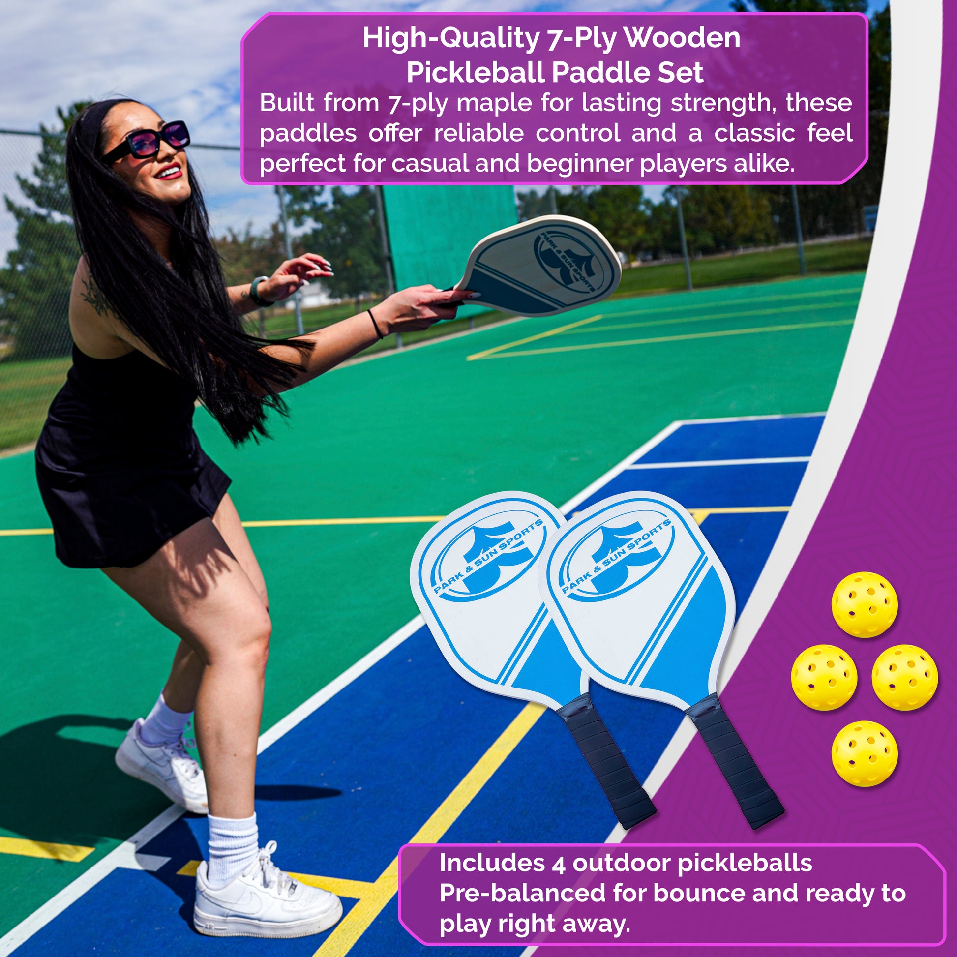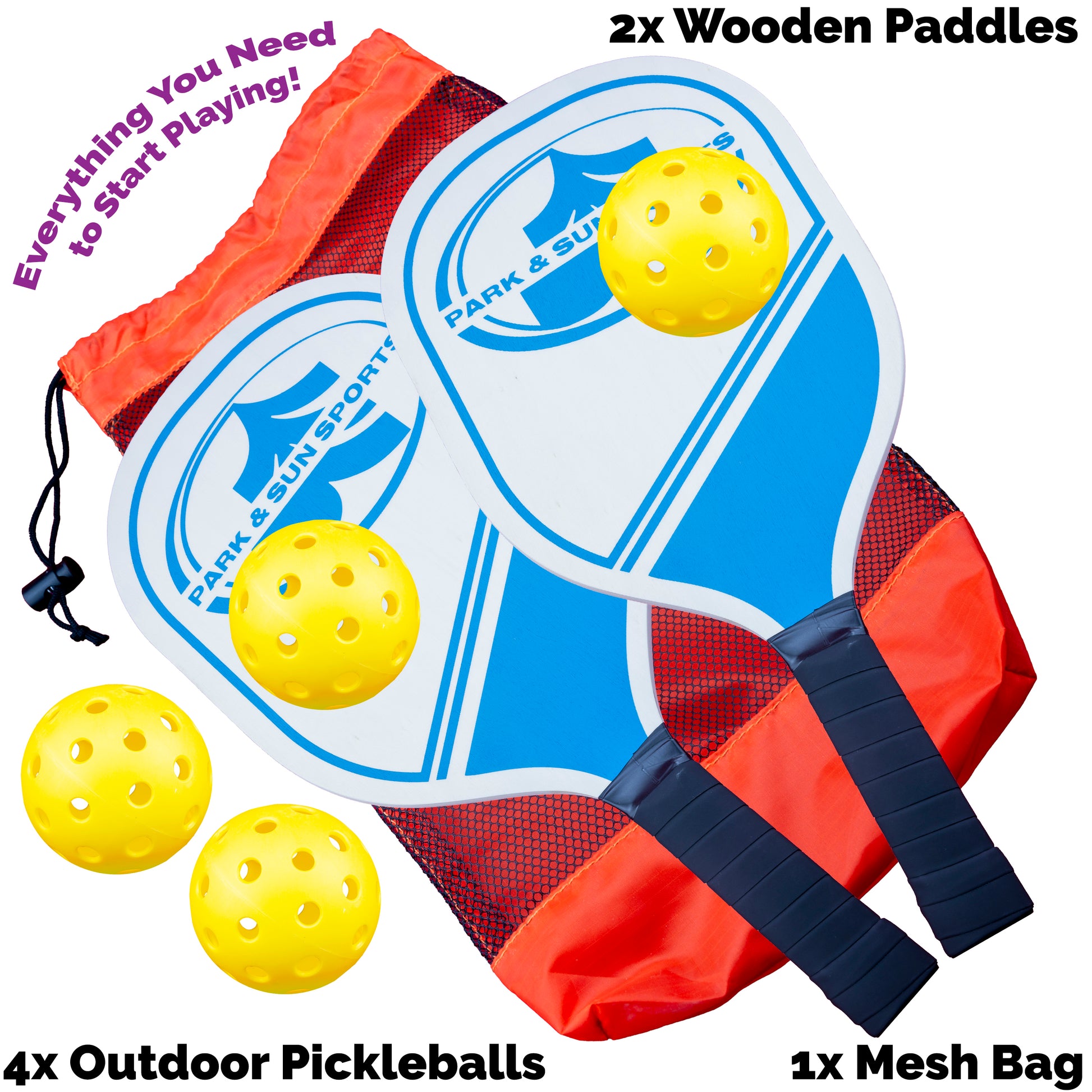 The Park & Sun Sports Pickleball Paddle set is a 2-player paddle and ball set with 2 premium wood paddles and 3 pickleballs.
